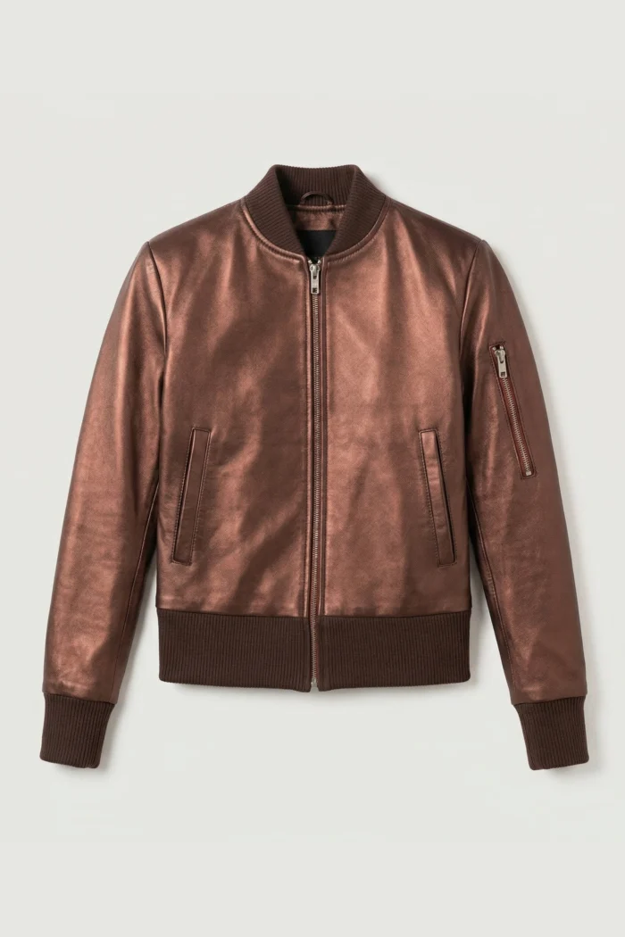 Crafted from premium sheepskin leather, this maroon bomber jacket features a smooth aniline finish and a comfortable quilted viscose lining. Designed with a classic varsity collar, rib-knit cuffs, and a sleek front zipper, it offers the perfect blend of style, warmth, and everyday versatility.
